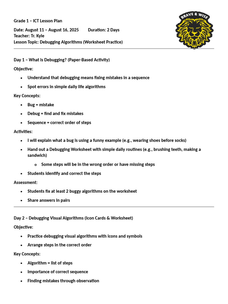 Lesson Topic: Debugging Algorithms (Worksheet Practice)