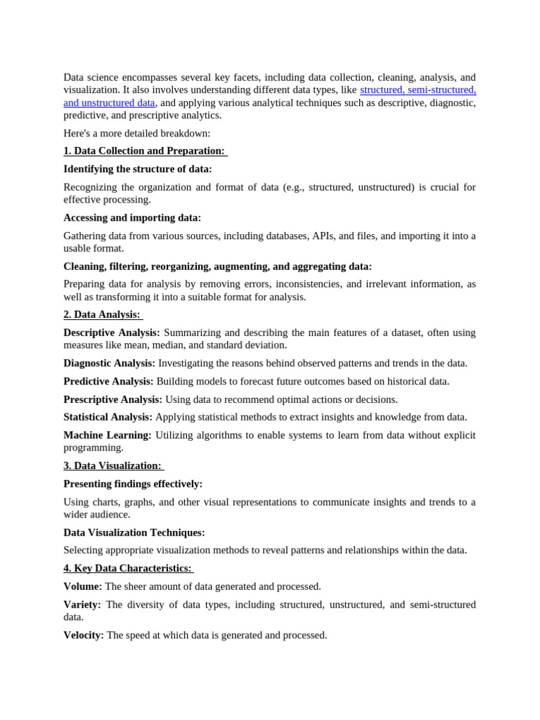 Data science encompasses several key facets, including data collection, cleaning, analysis, and
