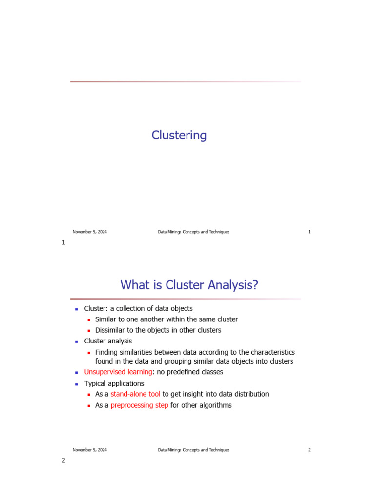 ◼ How good is the clustering generated by a method, and how can we compare the clustering