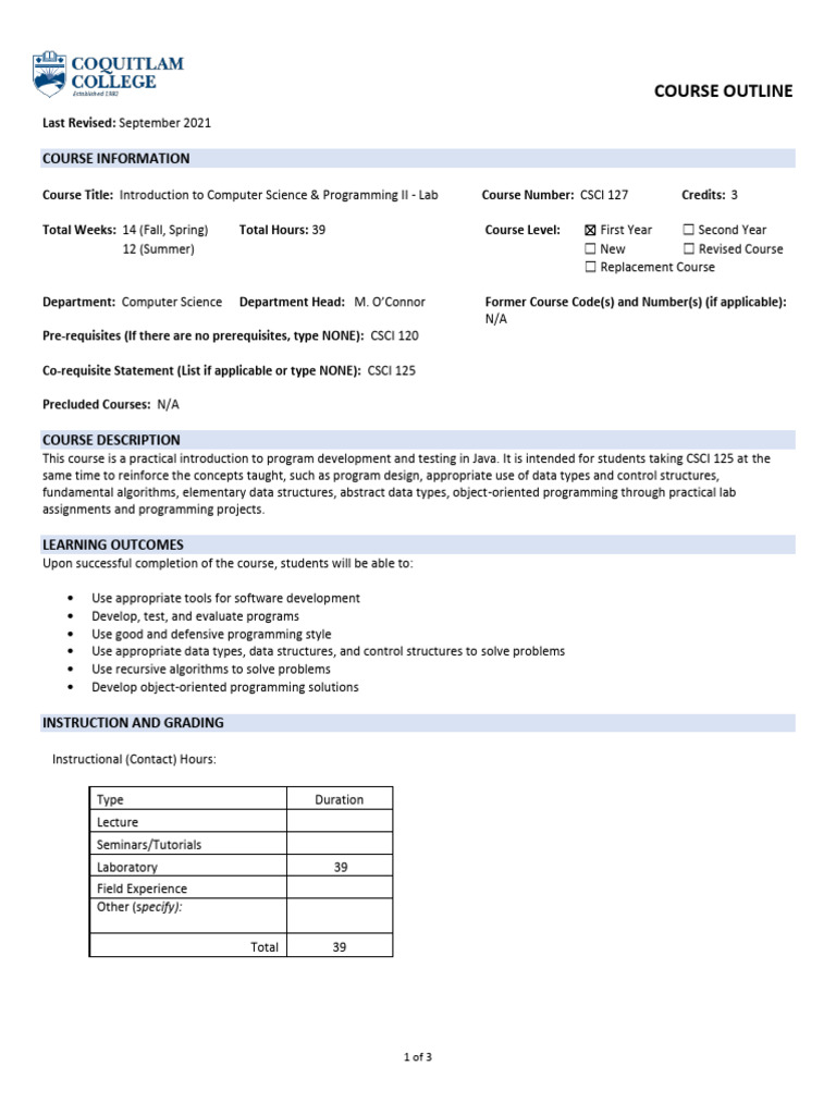 Course Title: Introduction to Computer Science & Programming II - Lab Course Number: CSCI 127 Credits: 3