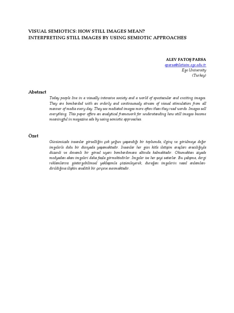 A Visual Semiotics Theory Surrounded with symbols, images and various signs, human being has always strived to signify them and utilized for communication. The meaning comes out of an interaction between the message and its reader (audience). While handling a text, one must consider not only its components but also the relation between those components, all the impressions it has created and the techniques used for creating such impressions as well. When the images urge us to react, we are aware of its effect upon us, which is resulted from myths, ideologies and connotations embedded in the images. Only through a sophisticated analysis, the hidden meaning under the obvious one could be formed. Visual semiotics deconstructs the communicative visuals while in its attempt to attain the meaning and ideology. Human being is acquainted with this signs throughout his life learning to use and signify them. The evolution of modern person who is bombarded by encompassing audio-visual messages transmitted out by the means of mass communication is defined by Mehmet Rifat as follows: the new name of human being striving to signifying the world around him Homo Semioticus the whole life of the signifying human is a reading odyssey from then on (Rifat, 1996: 41). Reading is one of the most essential activities carried out by humans when encountered with a meaningful construction. It occurs in three basic levels: Perception, memorizing and interpretation and reconstruction of the signs (Gnay, 2001: 17). A literary or musical work of art, a portrait as a visually