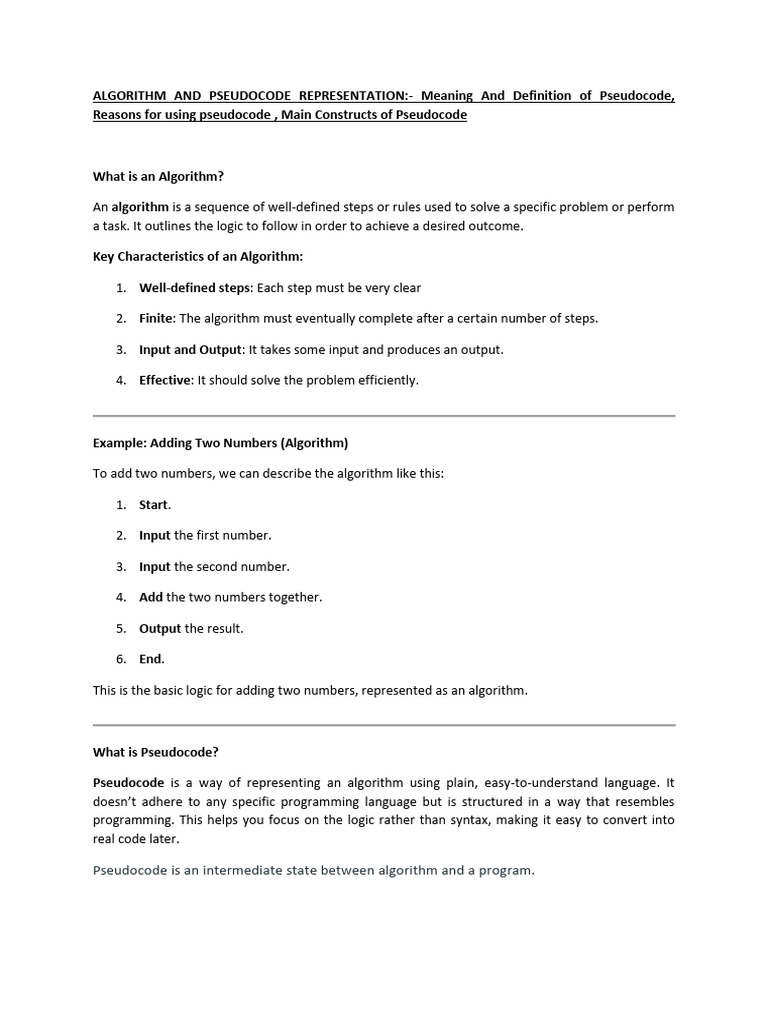 ALGORITHM AND PSEUDOCODE REPRESENTATION:- Meaning And Definition of Pseudocode,