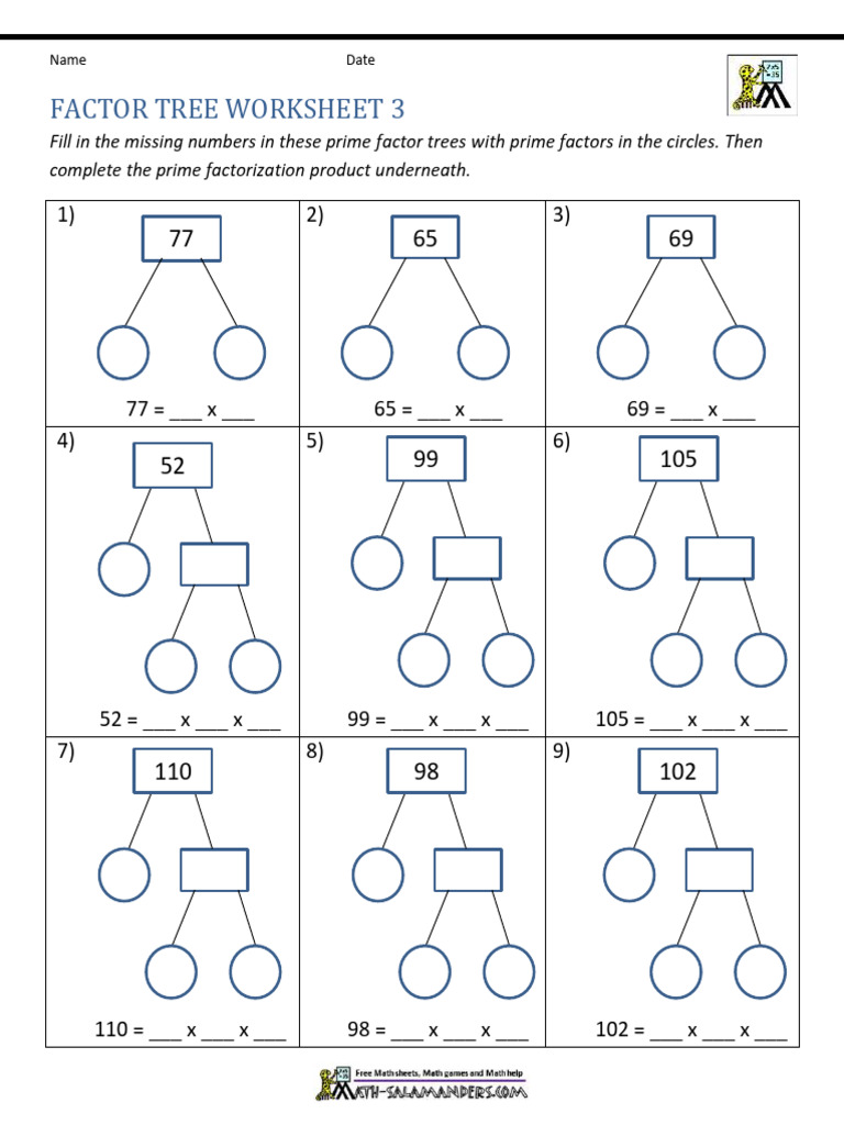 52 = ___ x ___ x ___ 99 = ___ x ___ x ___ 105 = ___ x ___ x ___