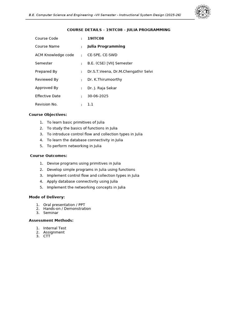 Computer Science and Engineering –VII Semester - Instructional System Design (2025-26)