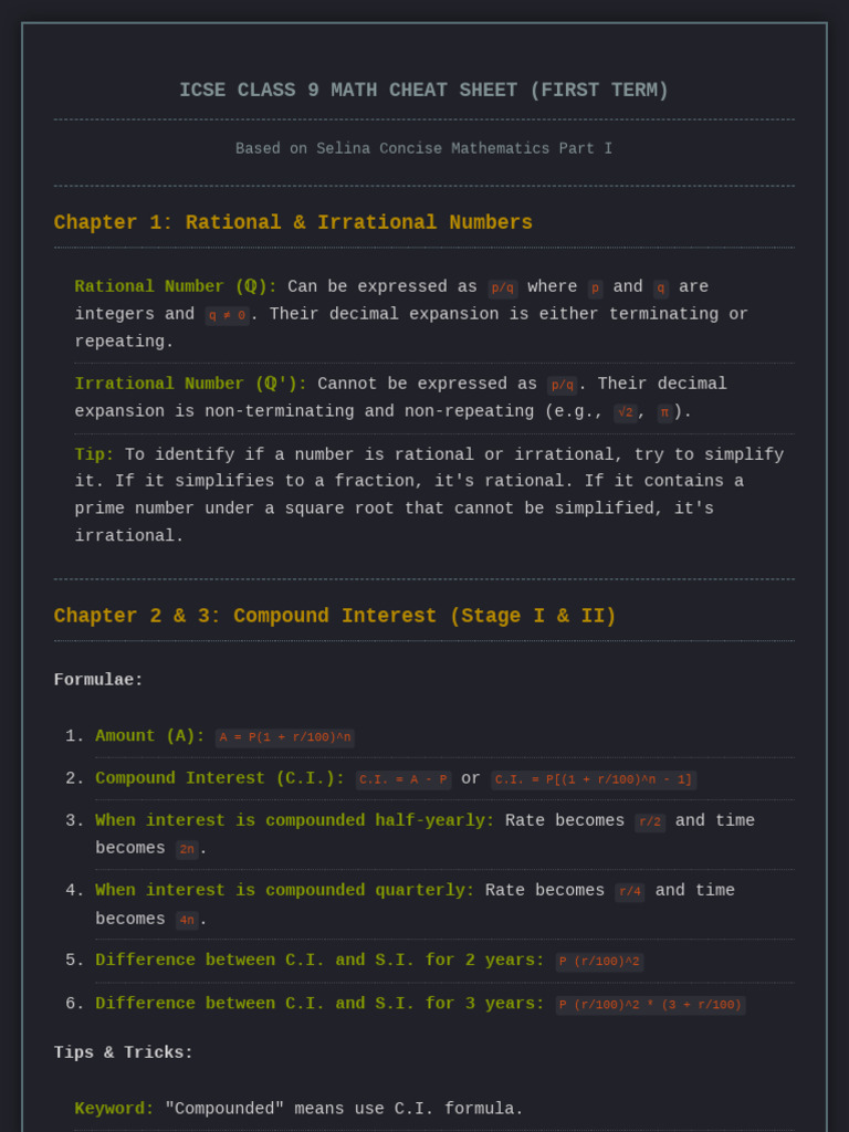 ICSE CLASS 9 MATH CHEAT SHEET (FIRST TERM)