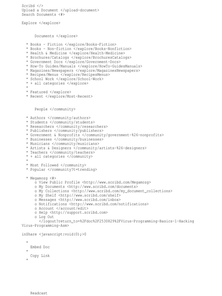 * Megamozg <#> o View Public Profile <http://www.scribd.com/Megamozg> o My Documents <http://www.scribd.com/documents> o My Collections <http://www.scribd.com/my_document_collections> o My Shelf <http://www.scribd.com/shelf> o Messages <http://www.scribd.com/inbox> o Notifications <http://www.scribd.com/notifications> o Account </account/edit> o Help <http://support.scribd.com> o Log Out </logout?return_to=%2Fdoc%2F2530829%2FVirus-Programming-Basics-1-Hacking Virus-Programming-Asm> inShare <javascript:void(0);>0 * Embed Doc * Copy Link *