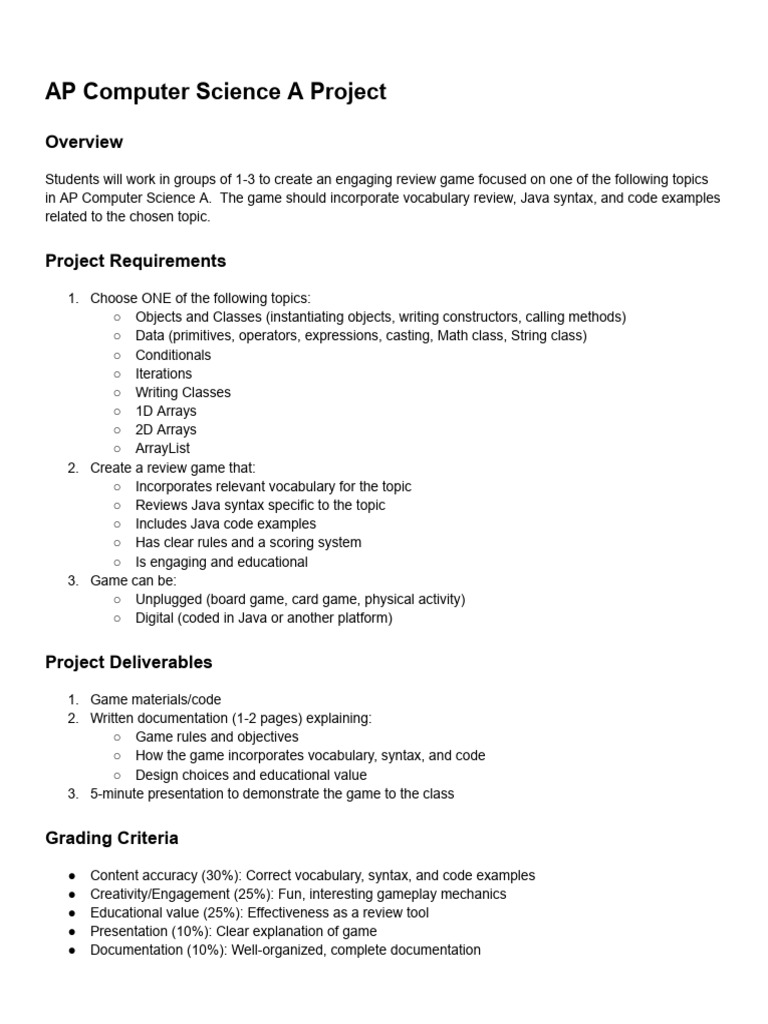 in AP Computer Science A. The game should incorporate vocabulary review, Java syntax, and code examples