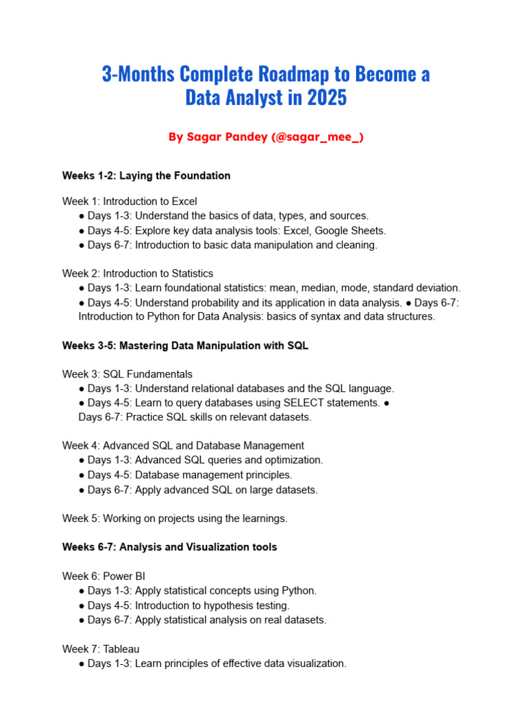 Excel -> Statistics -> SQL -> Power BI -> Python -> Portfolio -> Soft skills