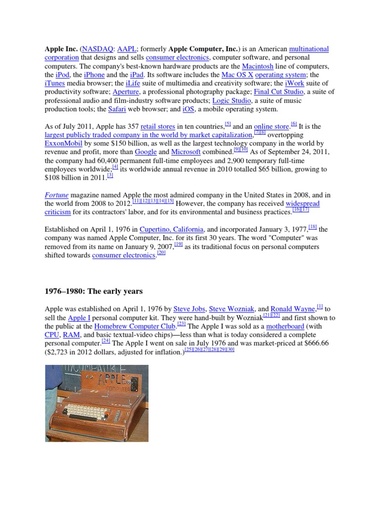 ) is an American multinational corporation that designs and sells consumer electronics, computer software, and personal computers. The company's best-known hardware products are the Macintosh line of computers, the iPod, the iPhone and the iPad. Its software includes the Mac OS X operating system; the iTunes media browser; the iLife suite of multimedia and creativity software; the iWork suite of productivity software; Aperture, a professional photography package; Final Cut Studio, a suite of professional audio and film-industry software products; Logic Studio, a suite of music production tools; the Safari web browser; and iOS, a mobile operating system. As of July 2011, Apple has 357 retail stores in ten countries,[5] and an online store.[6] It is the largest publicly traded company in the world by market capitalization,[7][8] overtopping ExxonMobil by some $150 billion, as well as the largest technology company in the world by revenue and profit, more than Google and Microsoft combined.[9][10] As of September 24, 2011, the company had 60,400 permanent full-time employees and 2,900 temporary full-time employees worldwide;[4] its worldwide annual revenue in 2010 totalled $65 billion, growing to $108 billion in 2011.[3] Fortune magazine named Apple the most admired company in the United States in 2008, and in the world from 2008 to 2012.[11][12][13][14][15] However, the company has received widespread criticism for its contractors' labor, and for its environmental and business practices.[16][17] Established on April 1, 1976 in Cupertino, California, and incorporated January 3, 1977,[18] the company was named Apple Computer, Inc. for its first 30 years. The word "Computer" was removed from its name on January 9, 2007,[19] as its traditional focus on personal computers shifted towards consumer electronics.[20]