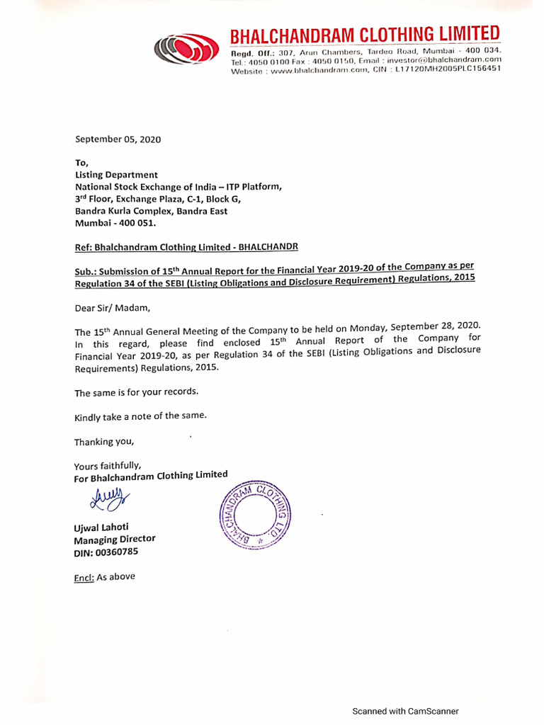 Bhalchandram Clothing Limited: Sub.: Submission of 15'" Annual Report For