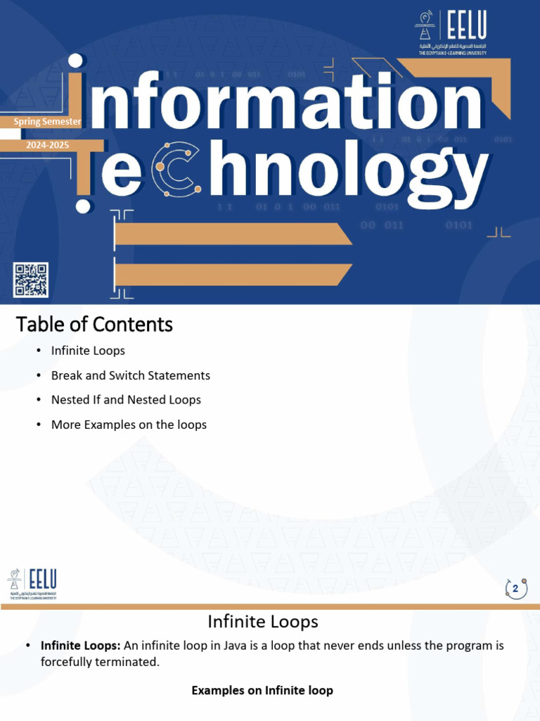 • Infinite Loops: An infinite loop in Java is a loop that never ends unless the program is