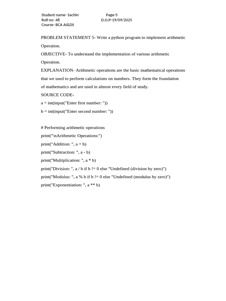 PROBLEM STATEMENT 5- Write a python program to implement arithmetic