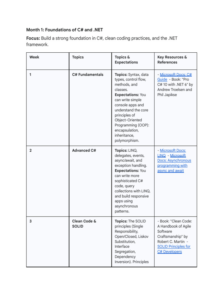 Focus: Build a strong foundation in C#, clean coding practices, and the .NET