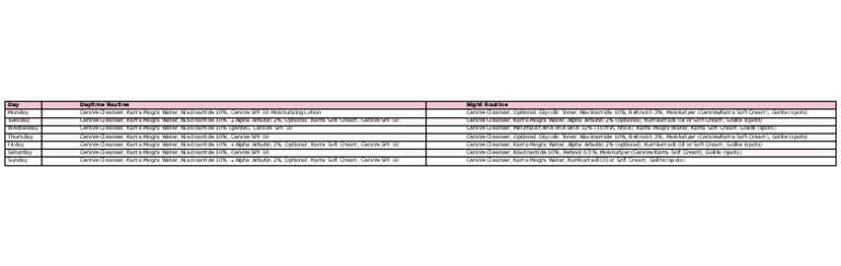 Thursday CeraVe Cleanser, Kama Mogra Water, Niacinamide 10%, CeraVe SPF 50 CeraVe Cleanser, Optional: Glycolic Toner, Niacinamide 10%, Retinol 0.3%, Moisturizer (CeraVe/Kama Soft Cream), Golite (spots)
