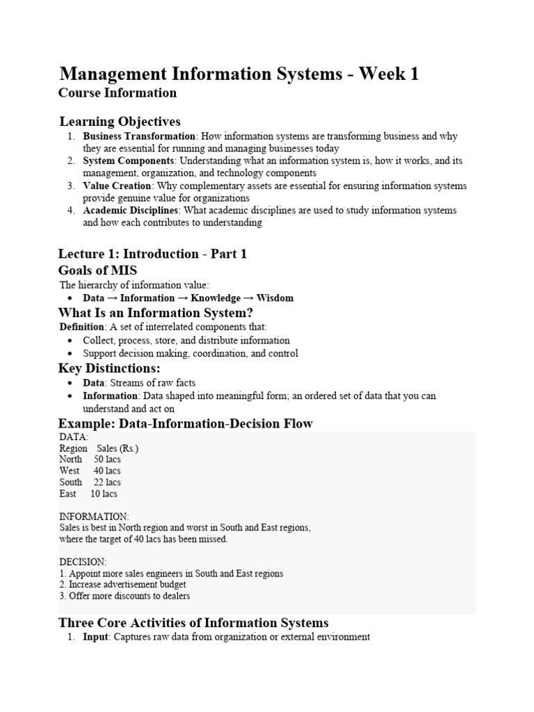 These notes provide a comprehensive overview of Week 1 MIS lectures covering fundamental