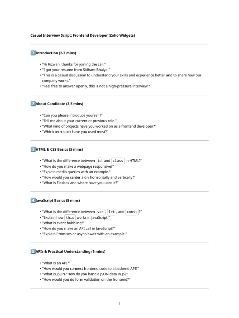 Casual Interview Script: Frontend Developer (Zoho Widgets)