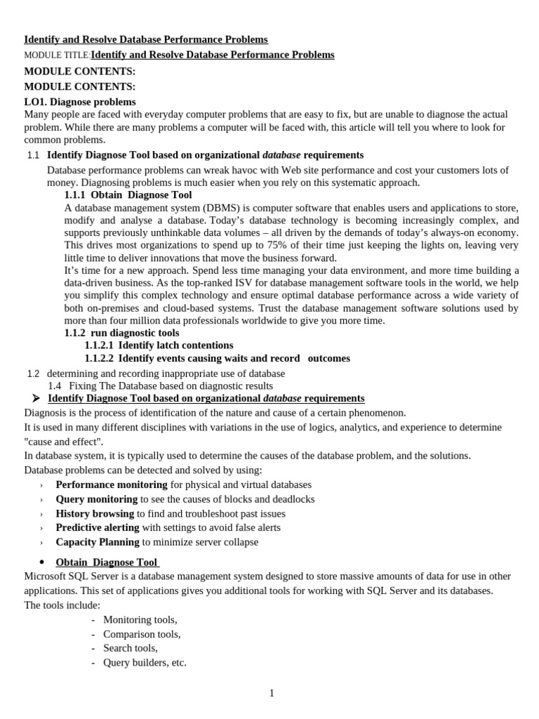 1.1 Identify Diagnose Tool based on organizational database requirements