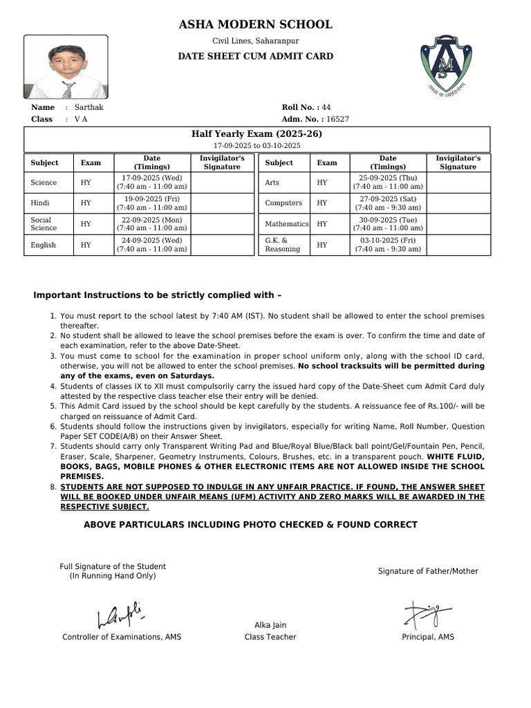 5. This Admit Card issued by the school should be kept carefully by the students. A reissuance fee of Rs.100/- will be