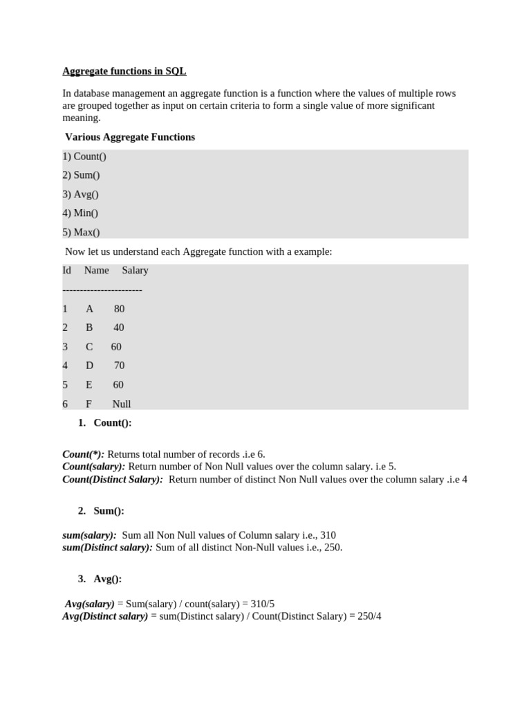 sum(Distinct salary): Sum of all distinct Non-Null values i.e., 250.