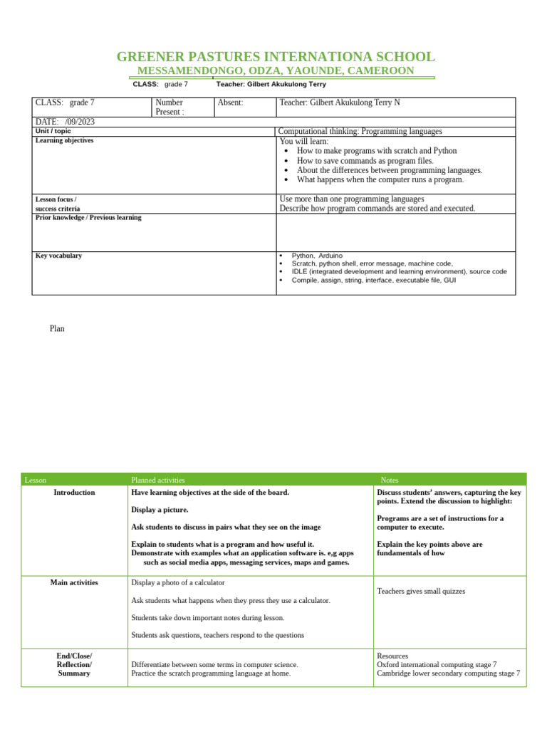 CLASS: grade 7 Number Absent: Teacher: Gilbert Akukulong Terry N