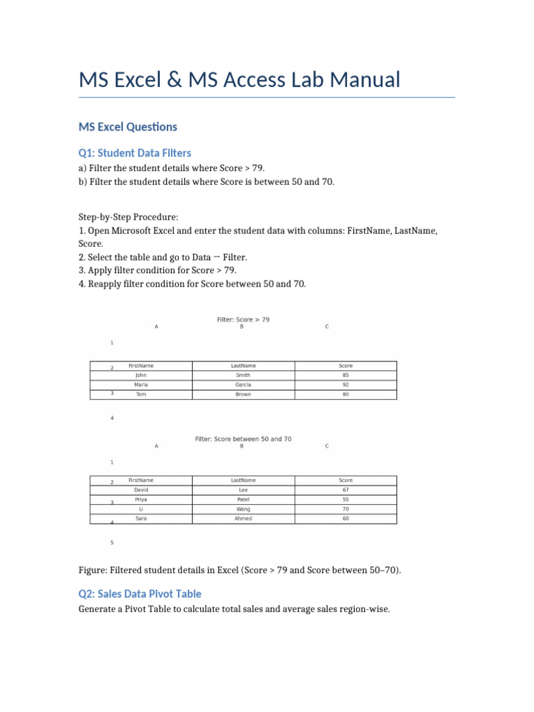 Figure: Filtered student details in Excel (Score > 79 and Score between 50–70).