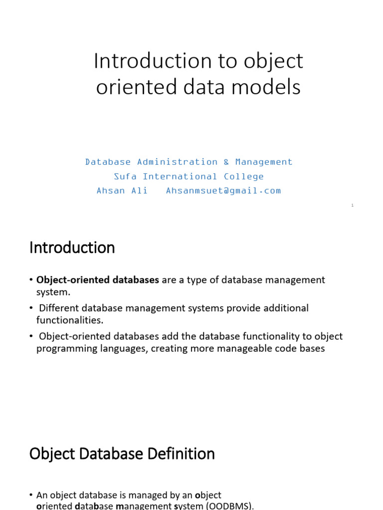 • The main characteristic of objects in OODBMS is the possibility of user-