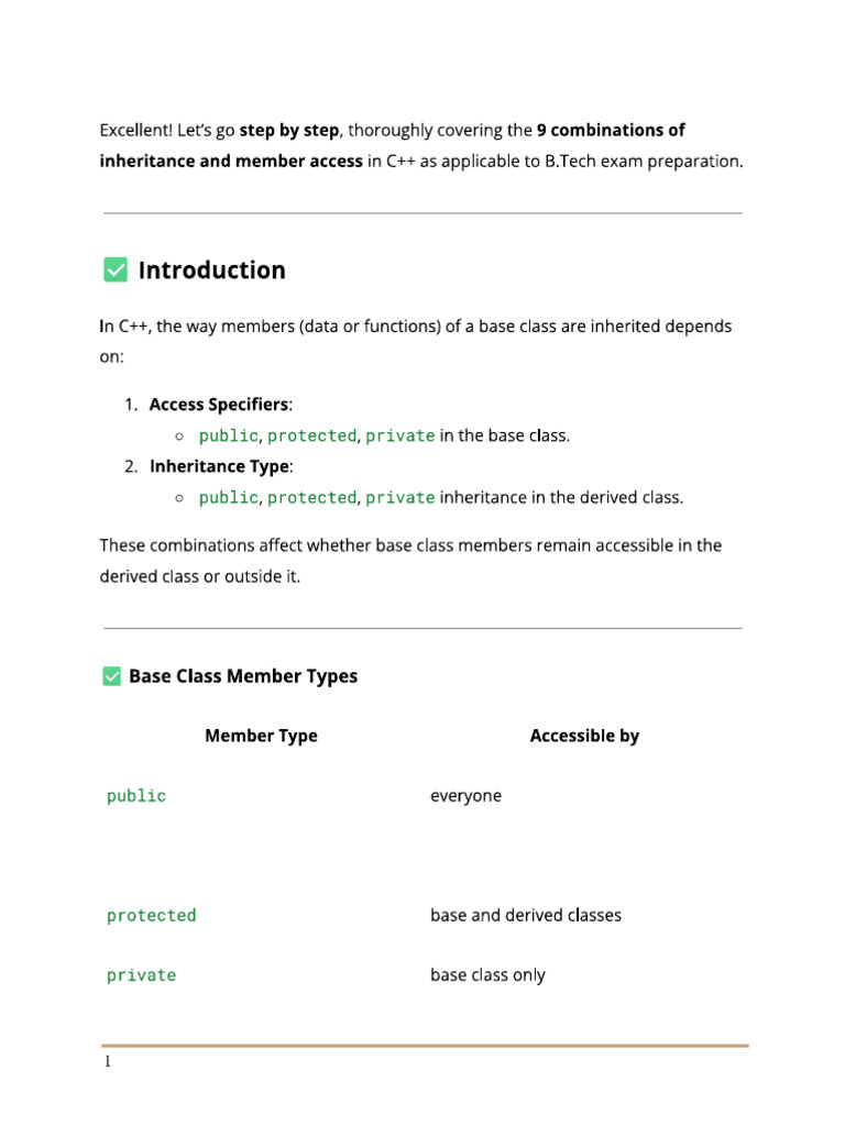 inheritance and member access in C++ as applicable to B.Tech exam preparation.