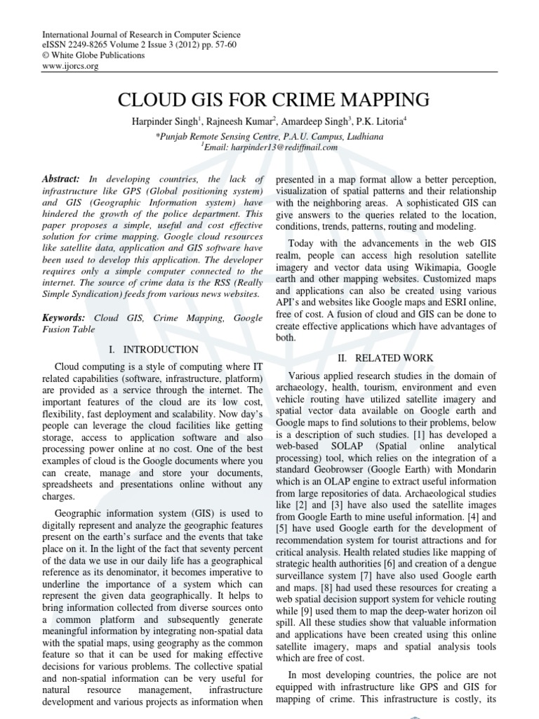 Abstract: In developing countries, the lack of infrastructure like GPS (Global positioning system) and GIS (Geographic Information system) have hindered the growth of the police department. This paper proposes a simple, useful and cost effective solution for crime mapping. Google cloud resources like satellite data, application and GIS software have been used to develop this application. The developer requires only a simple computer connected to the internet. The source of crime data is the RSS (Really Simple Syndication) feeds from various news websites. Keywords: Cloud GIS, Crime Mapping, Google Fusion Table I. INTRODUCTION Cloud computing is a style of computing where IT related capabilities (software, infrastructure, platform) are provided as a service through the internet. The important features of the cloud are its low cost, flexibility, fast deployment and scalability. Now days people can leverage the cloud facilities like getting storage, access to application software and also processing power online at no cost. One of the best examples of cloud is the Google documents where you can create, manage and store your documents, spreadsheets and presentations online without any charges. Geographic information system (GIS) is used to digitally represent and analyze the geographic features present on the earths surface and the events that take place on it. In the light of the fact that seventy percent of the data we use in our daily life has a geographical reference as its denominator, it becomes imperative to underline the importance of a system which can represent the given data geographically. It helps to bring information collected from diverse sources onto a common platform and subsequently generate meaningful information by integrating non-spatial data with the spatial maps, using geography as the common feature so that it can be used for making effective decisions for various problems. The collective spatial and non-spatial information can be very useful for natural resource management, infrastructure development and various projects as information when