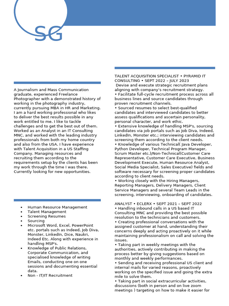 currently pursuing MBA in HR and Marketing. • Sourced resumes to select best-qualified