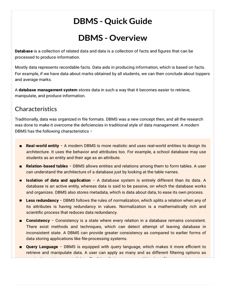ACID Properties − DBMS follows the concepts of Atomicity, Consistency, Isolation, and