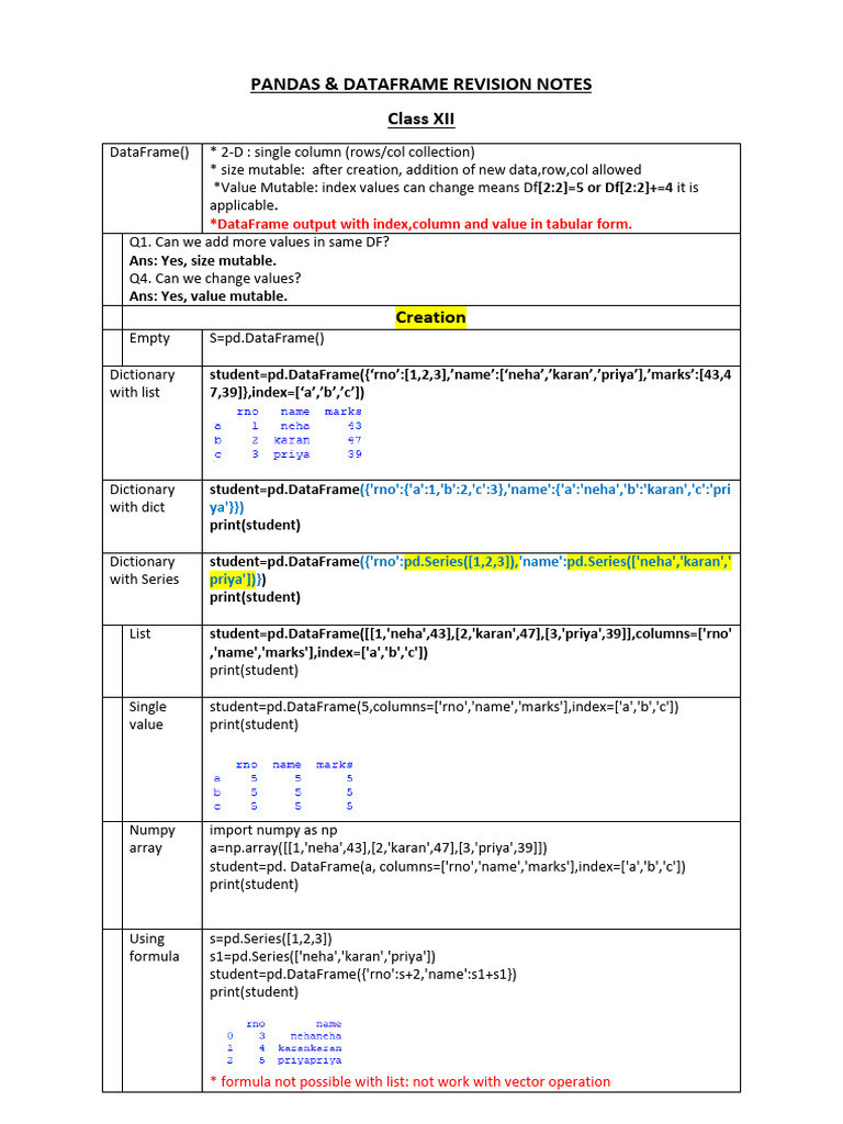 PANDAS & DATAFRAME REVISION NOTES
