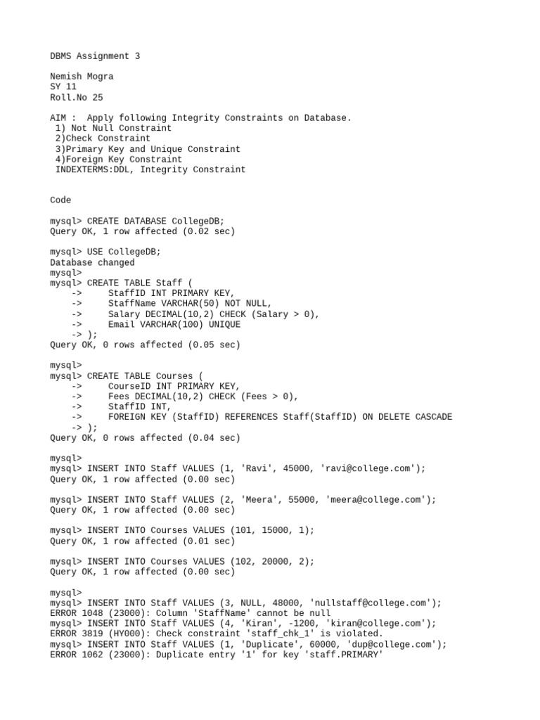 ERROR 1062 (23000): Duplicate entry 'ravi@college.com' for key 'staff.Email'