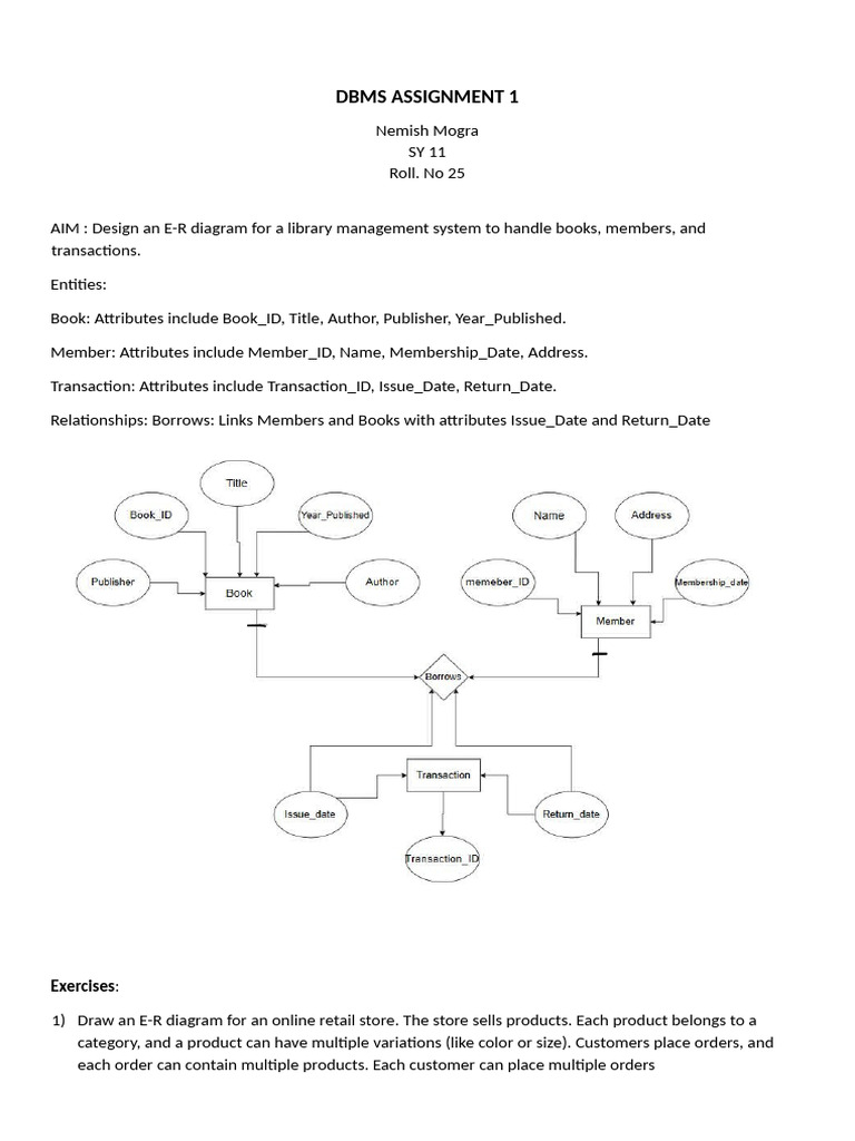 AIM : Design an E-R diagram for a library management system to handle books, members, and