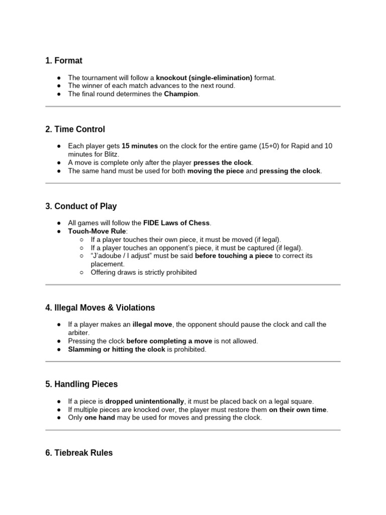● Each player gets 15 minutes on the clock for the entire game (15+0) for Rapid and 10