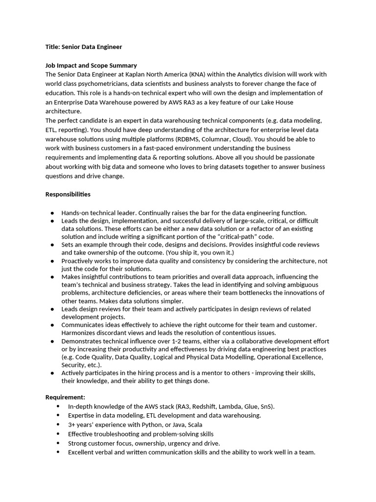 The Senior Data Engineer at Kaplan North America (KNA) within the Analytics division will work with