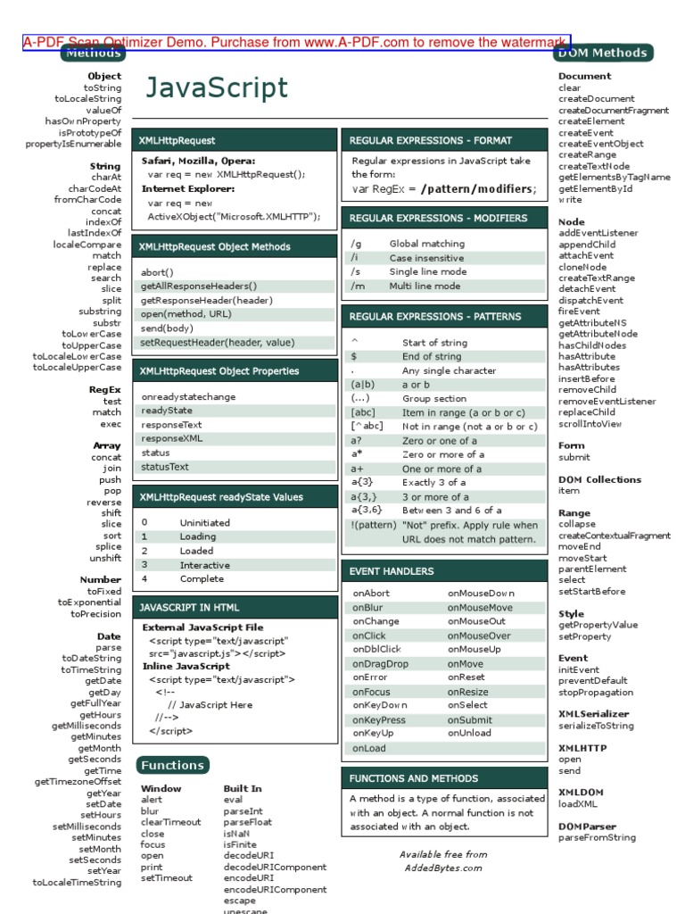 Window alert blur clearTimeout close focus open print setTimeout Built In eval parseInt parseFloat isNaN isFinite decodeURI decodeURIComponent encodeURI encodeURIComponent escape unescape FUNCTIONS AND METHODS A method is a type of function, associated with an object. A normal function is not associated with an object. Available free from AddedBytes.com