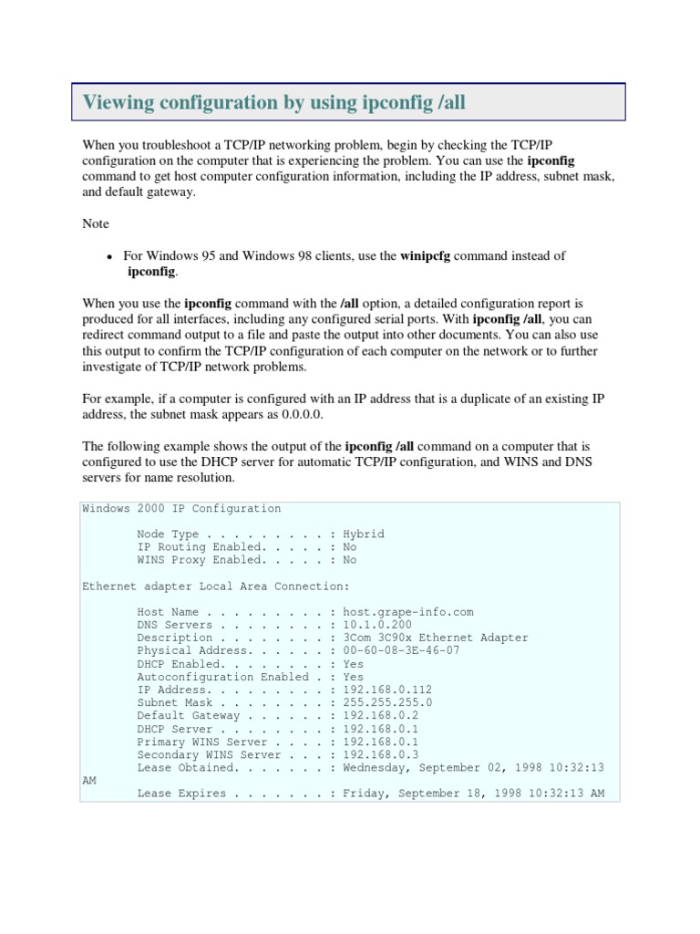 Windows 2000 IP Configuration Node Type . . . . . . . . . : Hybrid IP Routing Enabled. . . . . : No WINS Proxy Enabled. . . . . : No Ethernet adapter Local Area Connection: Host Name . . . . . . . . DNS Servers . . . . . . . Description . . . . . . . Physical Address. . . . . DHCP Enabled. . . . . . . Autoconfiguration Enabled IP Address. . . . . . . . Subnet Mask . . . . . . . Default Gateway . . . . . DHCP Server . . . . . . . Primary WINS Server . . . Secondary WINS Server . . Lease Obtained. . . . . . AM Lease Expires . . . . . . . : Friday, September 18, 1998 10:32:13 AM . . . . . . . . . . . . . : : : : : : : : : : : : : host.grape-info.com 10.1.0.200 3Com 3C90x Ethernet Adapter 00-60-08-3E-46-07 Yes Yes 192.168.0.112 255.255.255.0 192.168.0.2 192.168.0.1 192.168.0.1 192.168.0.3 Wednesday, September 02, 1998 10:32:13