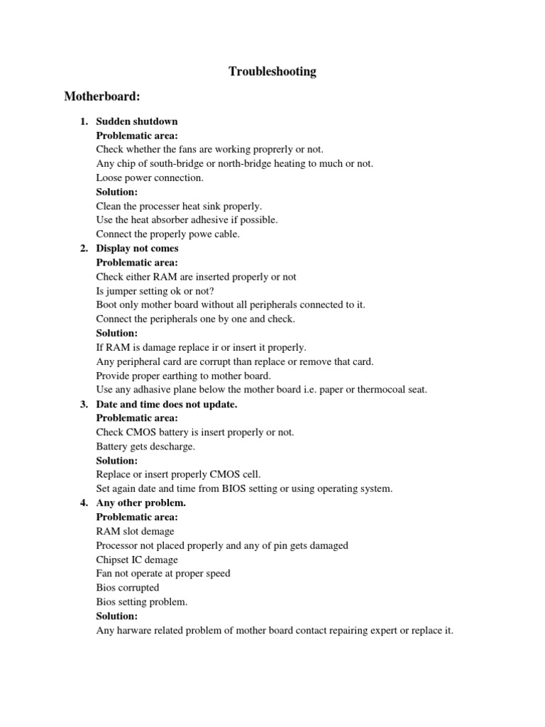 1. Sudden shutdown Problematic area: Check whether the fans are working proprerly or not. Any chip of south-bridge or north-bridge heating to much or not. Loose power connection. Solution: Clean the processer heat sink properly. Use the heat absorber adhesive if possible. Connect the properly powe cable. 2. Display not comes Problematic area: Check either RAM are inserted properly or not Is jumper setting ok or not? Boot only mother board without all peripherals connected to it. Connect the peripherals one by one and check. Solution: If RAM is damage replace ir or insert it properly. Any peripheral card are corrupt than replace or remove that card. Provide proper earthing to mother board. Use any adhasive plane below the mother board i.e. paper or thermocoal seat. 3. Date and time does not update. Problematic area: Check CMOS battery is insert properly or not. Battery gets descharge. Solution: Replace or insert properly CMOS cell. Set again date and time from BIOS setting or using operating system. 4. Any other problem. Problematic area: RAM slot demage Processor not placed properly and any of pin gets damaged Chipset IC demage Fan not operate at proper speed Bios corrupted Bios setting problem. Solution: Any harware related problem of mother board contact repairing expert or replace it.