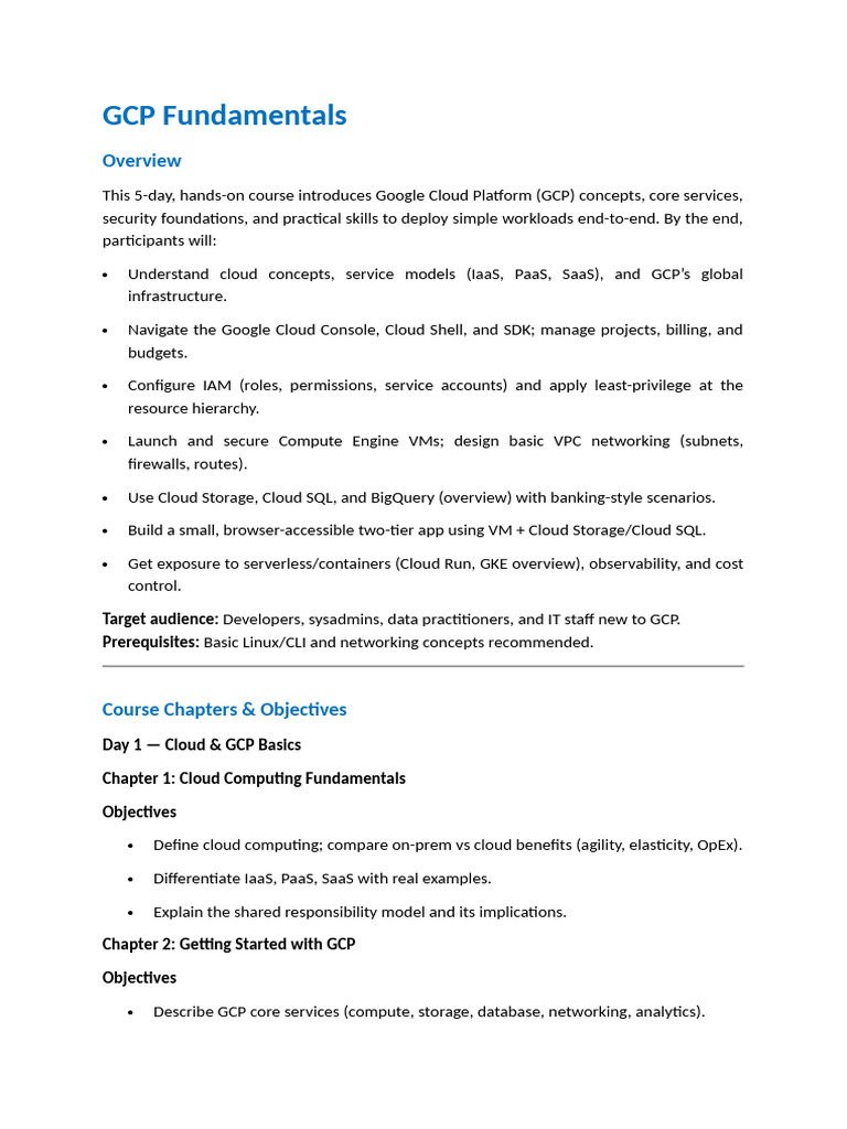 This 5-day, hands-on course introduces Google Cloud Platform (GCP) concepts, core services,