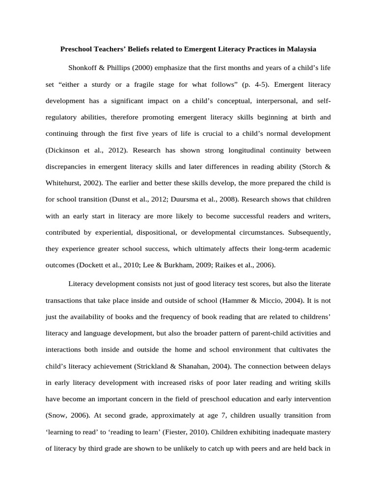 Lonigan, 2010; Snowling & Hulme, 2013). Emergent literacy is also regarded by researchers