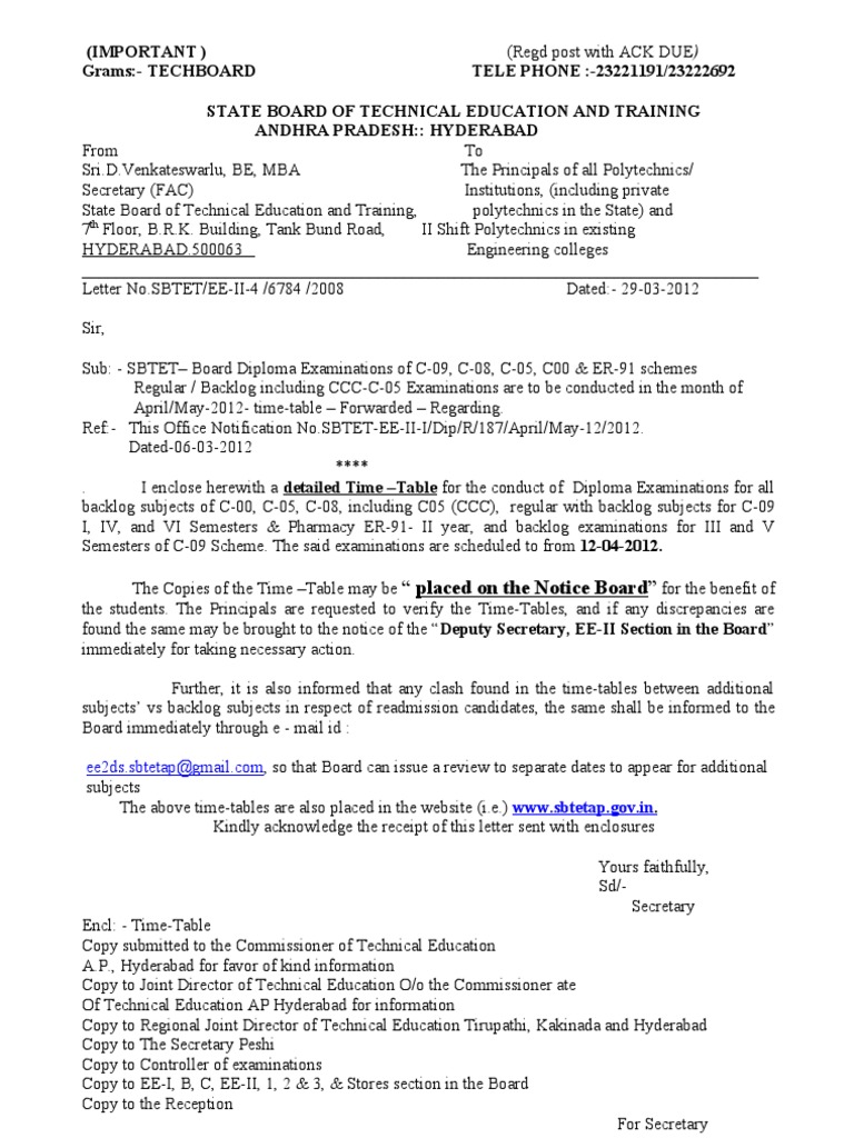 STATE BOARD OF TECHNICAL EDUCATION AND TRAINING ANDHRA PRADESH:: HYDERABAD From To Sri.D.Venkateswarlu, BE, MBA The Principals of all Polytechnics/ Secretary (FAC) Institutions, (including private State Board of Technical Education and Training, polytechnics in the State) and th 7 Floor, B.R.K. Building, Tank Bund Road, II Shift Polytechnics in existing HYDERABAD.500063 Engineering colleges ________________________________________________________________________________ Letter No.SBTET/EE-II-4 /6784 /2008 Dated:- 29-03-2012 Sir, Sub: - SBTET Board Diploma Examinations of C-09, C-08, C-05, C00 & ER-91 schemes Regular / Backlog including CCC-C-05 Examinations are to be conducted in the month of April/May-2012- time-table Forwarded Regarding. Ref:- This Office Notification No.SBTET-EE-II-I/Dip/R/187/April/May-12/2012. Dated-06-03-2012 **** . I enclose herewith a detailed Time Table for the conduct of Diploma Examinations for all backlog subjects of C-00, C-05, C-08, including C05 (CCC), regular with backlog subjects for C-09 I, IV, and VI Semesters & Pharmacy ER-91- II year, and backlog examinations for III and V Semesters of C-09 Scheme. The said examinations are scheduled to from 12-04-2012. The Copies of the Time Table may be placed on the Notice Board for the benefit of the students. The Principals are requested to verify the Time-Tables, and if any discrepancies are found the same may be brought to the notice of the Deputy Secretary, EE-II Section in the Board immediately for taking necessary action. Further, it is also informed that any clash found in the time-tables between additional subjects vs backlog subjects in respect of readmission candidates, the same shall be informed to the Board immediately through e - mail id : ee2ds.sbtetap@gmail.com, so that Board can issue a review to separate dates to appear for additional subjects The above time-tables are also placed in the website (i.e.) www.sbtetap.gov.in. Kindly acknowledge the receipt of this letter sent with enclosures Yours faithfully, Sd/Secretary Encl: - Time-Table Copy submitted to the Commissioner of Technical Education A.P., Hyderabad for favor of kind information Copy to Joint Director of Technical Education O/o the Commissioner ate Of Technical Education AP Hyderabad for information Copy to Regional Joint Director of Technical Education Tirupathi, Kakinada and Hyderabad Copy to The Secretary Peshi Copy to Controller of examinations Copy to EE-I, B, C, EE-II, 1, 2 & 3, & Stores section in the Board Copy to the Reception For Secretary