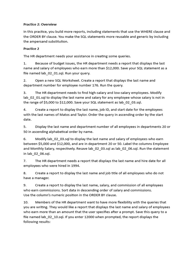 In this practice, you build more reports, including statements that use the WHERE clause and