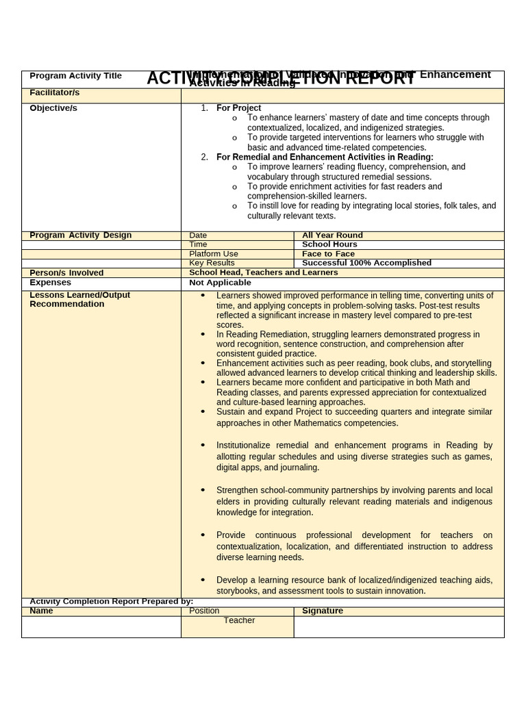 Lessons Learned/Output Learners showed improved performance in telling time, converting units of
