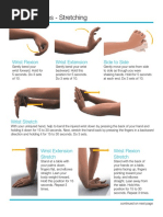 Rest your forearms on the arms of a chair so your wrists are supported by the ends of the chairs arms and your fingers hang free. Bend your wrists back, lifting your hands up toward you, and then lower your hands back down. Repeat the lifting and lowering 5 to 10 times. Next, try some rotations. Keep your elbows in place, and rotate your forearms so your palms are facing upward. Hold for a moment, and then rotate again, turning your palms back over. Repeat 5 to 10 times.