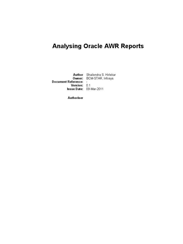 AWR (Automatic Workload Repository) Reports are very handy during performance tuning of the database. These reports provide clear picture of database side activities. Various useful data is nicely documented in different sections in readable format. It becomes necessity to understand these reports for teams involved in activities like database tuning, performance/ load testing or analysing any performance issue. Purpose of the document is to enable the reader to understand basic AWR terminology and to use these details for understanding the database performance issues.
