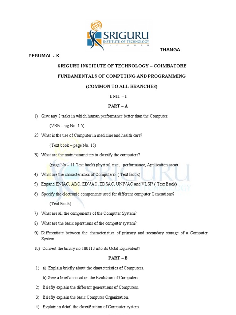 SRIGURU INSTITUTE OF TECHNOLOGY COIMBATORE FUNDAMENTALS OF COMPUTING AND PROGRAMMING (COMMON TO ALL BRANCHES)
