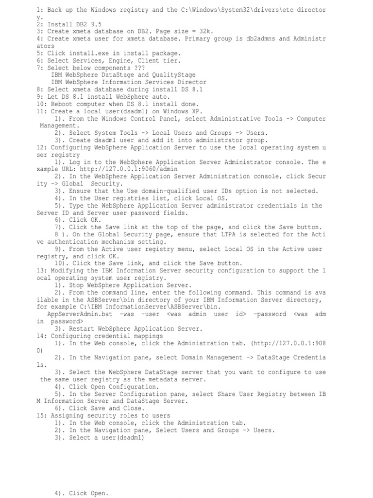 Page size = 32k. 4: Create xmeta user for xmeta database. Primary group is db2admns and Administr ators 5: Click install.exe in install package. 6: Select Services, Engine, Client tier. 7: Select below components ??? IBM WebSphere DataStage and QualityStage IBM WebSphere Information Services Director 8: Select xmeta database during install DS 8.1 9: Let DS 8.1 install WebSphere auto. 10: Reboot computer when DS 8.1 install done. 11: Create a local user(dsadm1) on Windows XP. 1). From the Windows Control Panel, select Administrative Tools -> Computer Management. 2). Select System Tools -> Local Users and Groups -> Users. 3). Create dsadm1 user and add it into administrator group. 12: Configuring WebSphere Application Server to use the local operating system u ser registry 1). Log in to the WebSphere Application Server Administrator console. The e xample URL: http://127.0.0.1:9060/admin 2). In the WebSphere Application Server Administration console, click Secur ity -> Global Security. 3). Ensure that the Use domain-qualified user IDs option is not selected. 4). In the User registries list, click Local OS. 5). Type the WebSphere Application Server administrator credentials in the Server ID and Server user password fields. 6). Click OK. 7). Click the Save link at the top of the page, and click the Save button. 8 ). On the Global Security page, ensure that LTPA is selected for the Acti ve authentication mechanism setting. 9). From the Active user registry menu, select Local OS in the Active user registry, and click OK. 10). Click the Save link, and click the Save button. 13: Modifying the IBM Information Server security configuration to support the l ocal operating system user registry. 1). Stop WebSphere Application Server. 2). From the command line, enter the following command. This command is ava ilable in the ASBServer\bin directory of your IBM Information Server directory, for example C:\IBM InformationServer\ASBServer\bin. AppServerAdmin.bat -was -user <was admin user id> -password <was adm in password> 3). Restart WebSphere Application Server. 14: Configuring credential mappings 1). In the Web console, click the Administration tab. (http://127.0.0.1:908 0) 2). In the Navigation pane, select Domain Management -> DataStage Credentia ls. 3). Select the WebSphere DataStage server that you want to configure to use the same user registry as the metadata server. 4). Click Open Configuration. 5). In the Server Configuration pane, select Share User Registry between IB M Information Server and DataStage Server. 6). Click Save and Close. 15: Assigning security roles to users 1). In the Web console, click the Administration tab. 2). In the Navigation pane, Select Users and Groups -> Users. 3). Select a user(dsadm1)