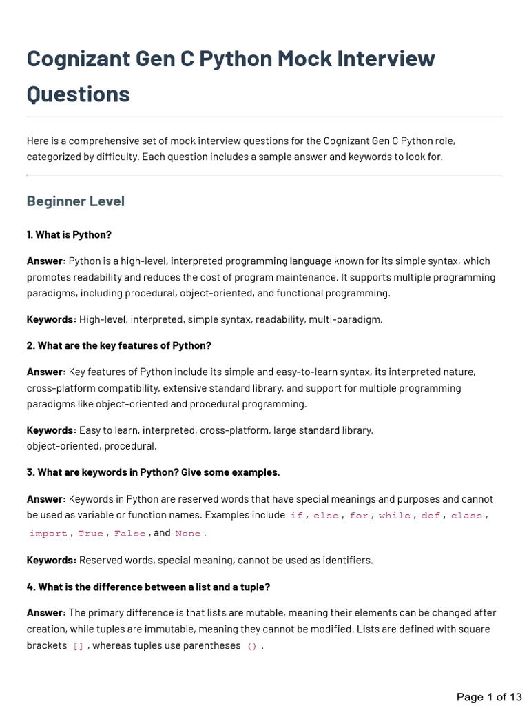 Here is a comprehensive set of mock interview questions for the Cognizant Gen C Python role,