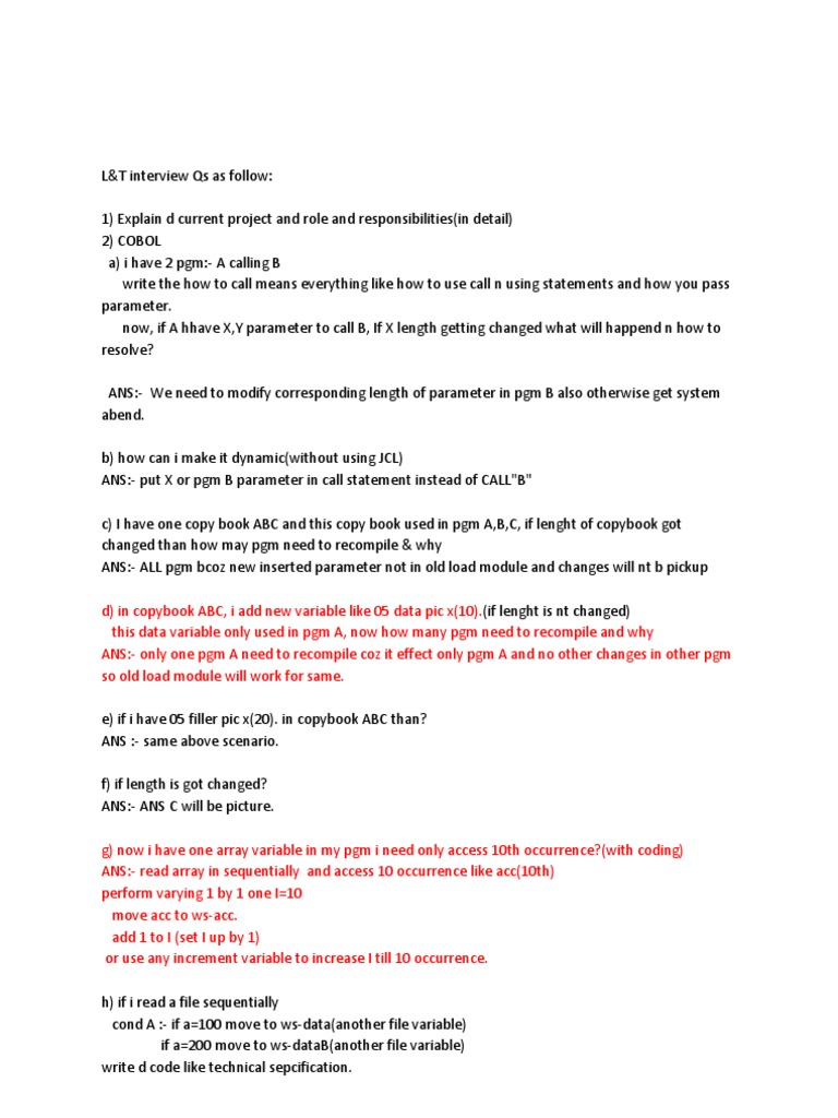 L&T interview Qs as follow: 1) Explain d current project and role and responsibilities(in detail) 2) COBOL a) i have 2 pgm:- A calling