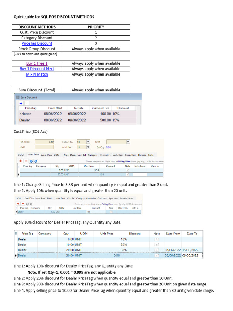 Line 2: Apply 20% discount for Dealer PriceTag when quantity equal and greater than 10 Unit.